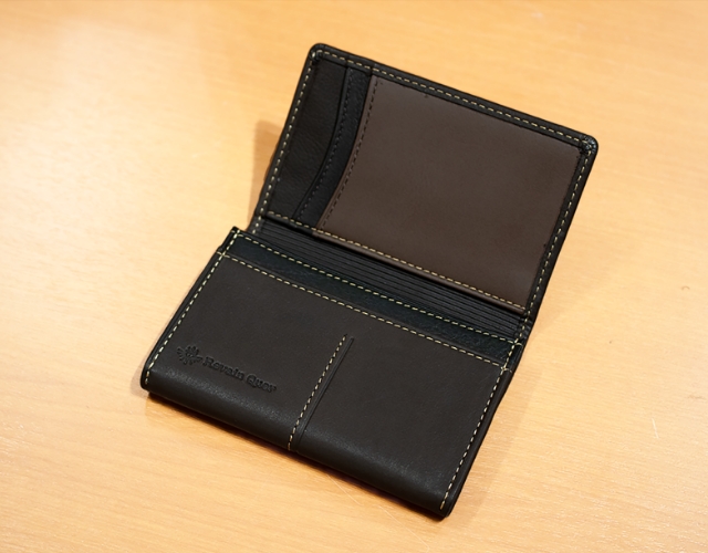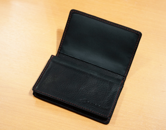 - A:黒やネイビーなど暗い色味の名刺入れは、金箔・銀箔の刻印が綺麗に映えるので人気が高いです。名刺入れは、国産原皮の中でも希少価値の高い北海道のカーフ(仔牛の革)を使用しておりますので、柔らかくお持ちいただきやすいと思います。