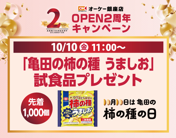 【オーケー銀座店OPEN2周年キャンペーン】10月10日は亀田の柿の種の日「亀田の柿の種 うましお」試食品プレゼント