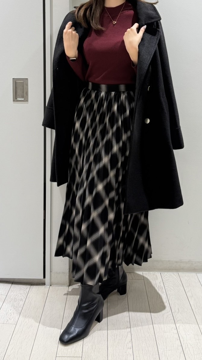 スカートは「EASYCARE プリーツスカート」で、歩くたび揺れるエレガントさをプラス。