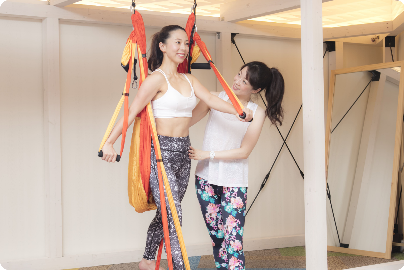 当サロンでは、ピラティスの本場であるニューヨーク発祥の空中ピラティスを提供しています。一見難しそうに見えますが、年齢や運動経験の有無を問わず、誰でも楽しみながら体幹を鍛え、キレイな姿勢づくりを目指せる大人気トレーニングです。姿勢の変化はもちろん、身体が伸びる感覚や、頭がすっきりする感覚を体感いただけます。