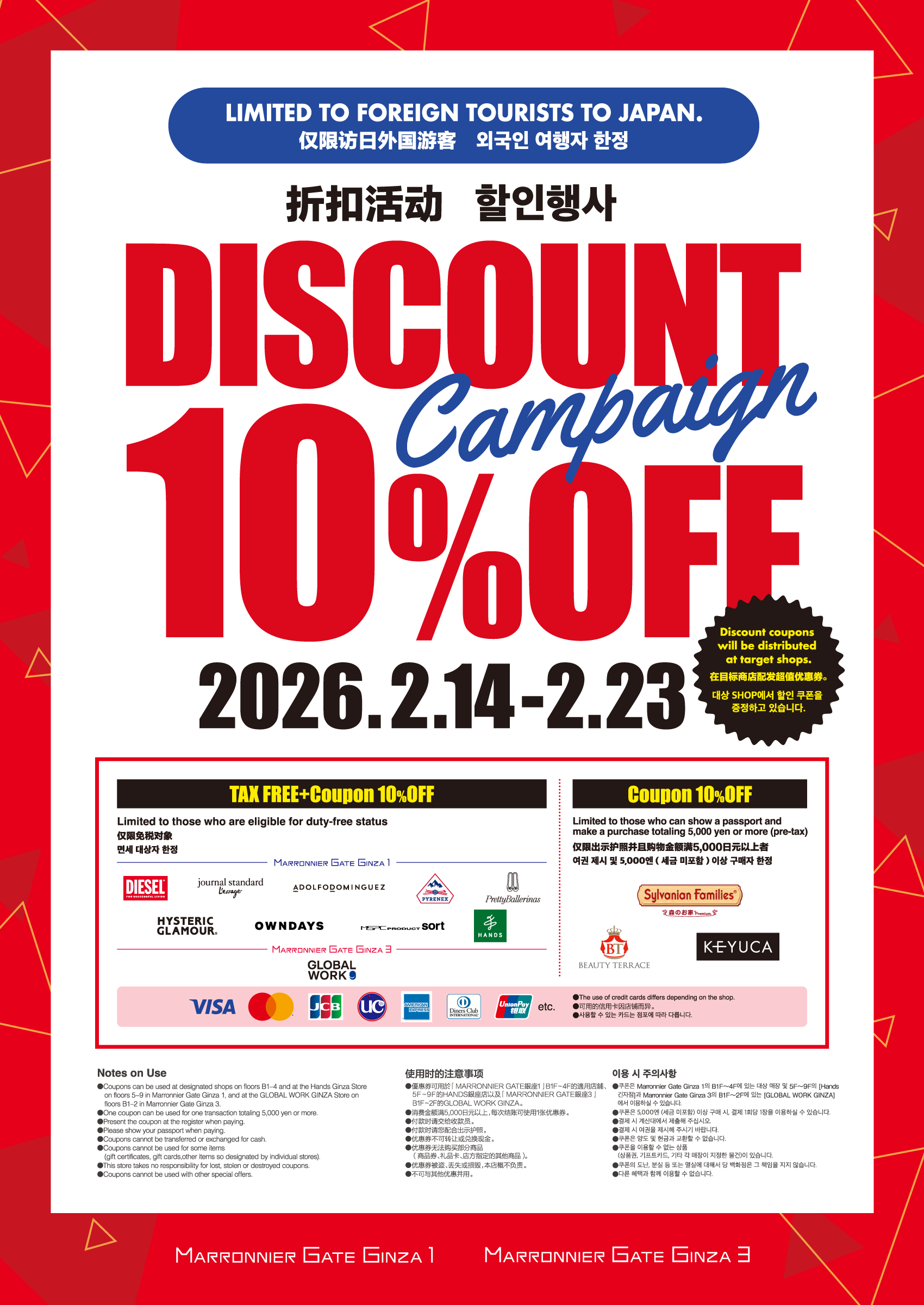 マロニエゲート銀座1・マロニエゲート銀座3 対象店舗にて、訪日外国人の皆さまを対象に「10%ディスカウントキャンペーン」を開催いたします!