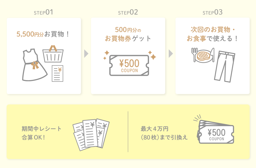全店舗で後日使用できる500円分の「お買物・お食事券」をプレゼント!