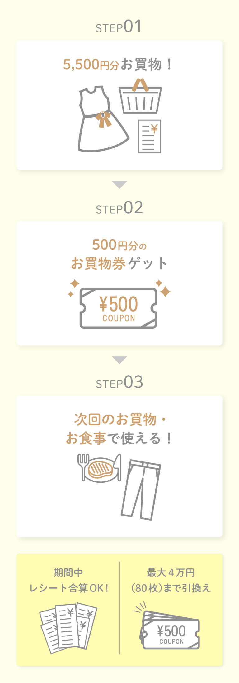税込5,500円お買い上げごとに「お買物・お食事券」500円分を1枚進呈