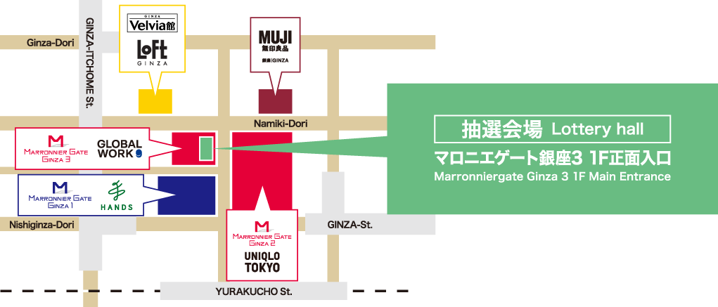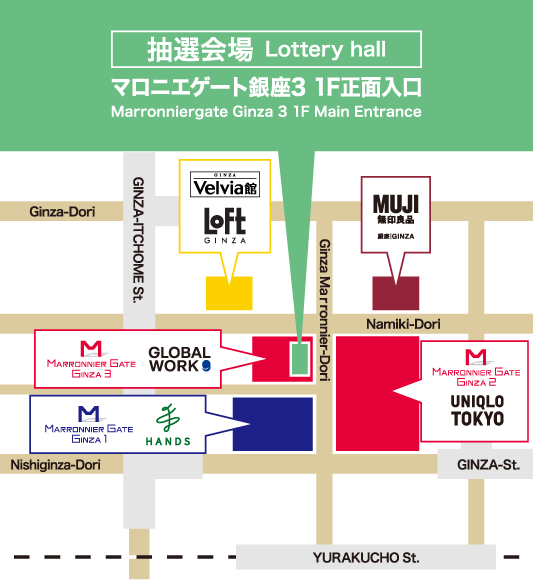 マロニエゲート銀座1、マロニエゲート銀座2、マロニエゲート銀座3、無印良品 銀座、銀座ベルビア館(銀座ロフトを含む全店舗)の当日のお買い上げレシートご持参で税込3,000円ごとに1回抽選できます。